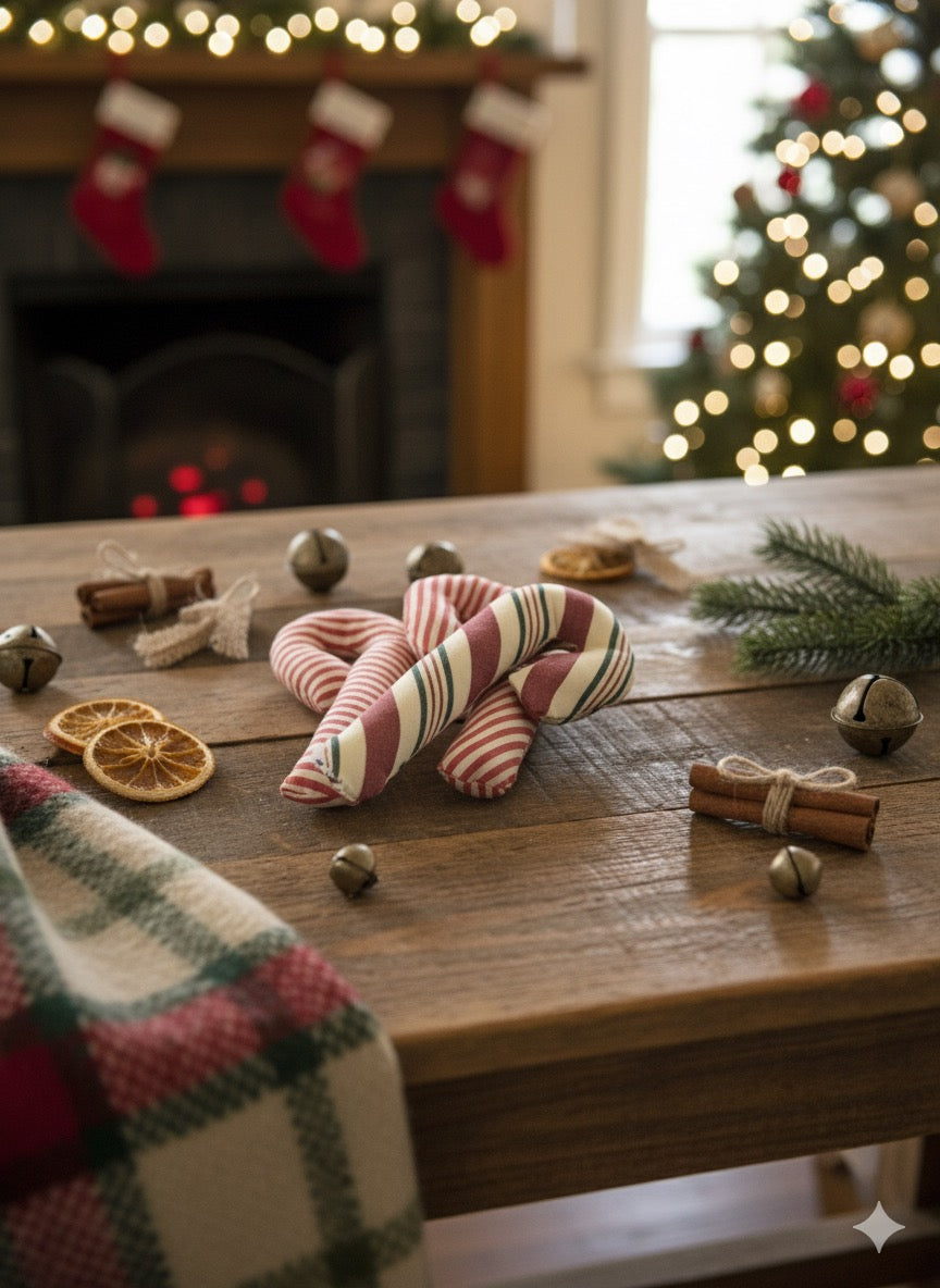 Porta il calore delle feste nella tua casa con i nostri candy cane decorativi in stoffa, realizzati a mano con tessuti naturali e motivi a righe rosse e verdi.